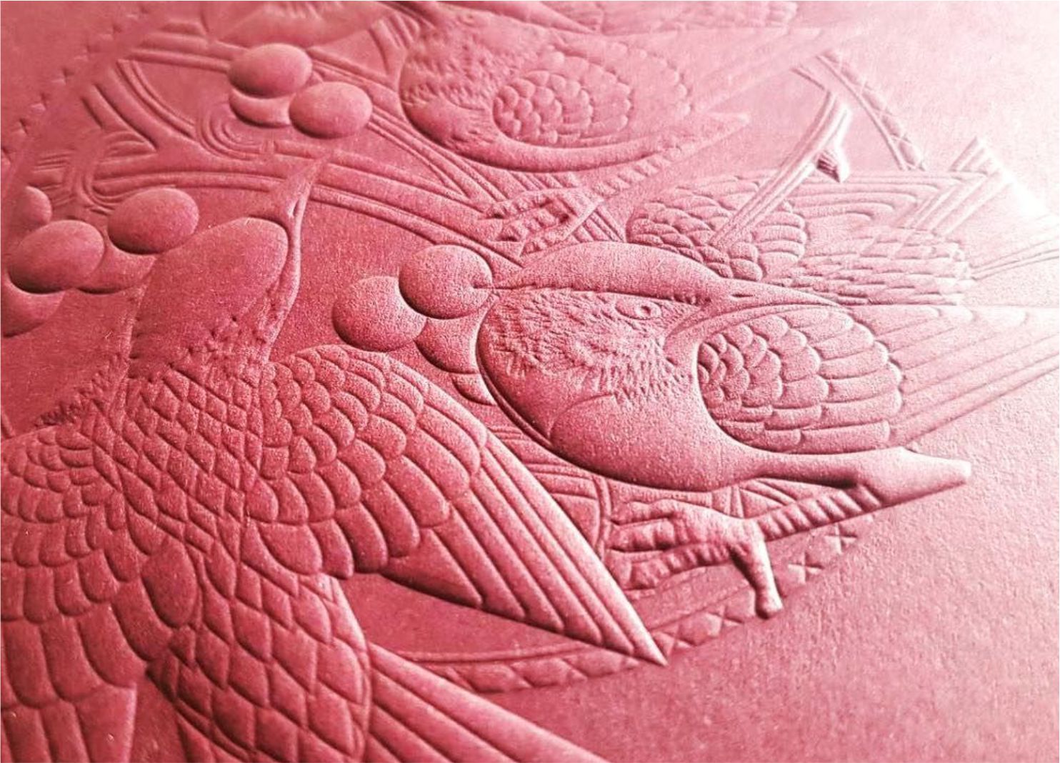 Embossing and debossing are the processes of creating either raised or recessed relief images and designs in paper and other materials. An embossed pattern is raised against the background, while a debossed pattern is sunken into the surface of the material but might protrude somewhat on the reverse side.